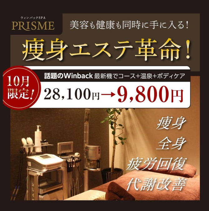 本日はWINBACKボディケア75分+温泉券付で¥9,800(税込)にてお得に体験していただけるキャンペーンのお知らせです📢